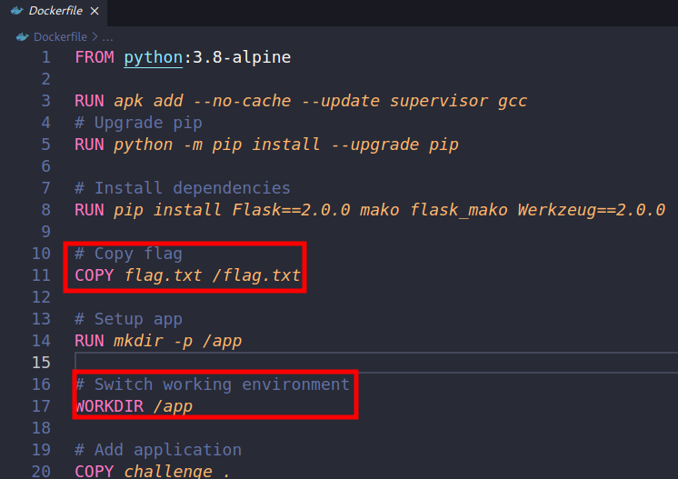 Por suerte tenemos el código fuente para ayudarnos. Empezando con el archivo Dockerfile notamos que la flag está ubicada en /flag.txt, esta información nos servirá más adelante.