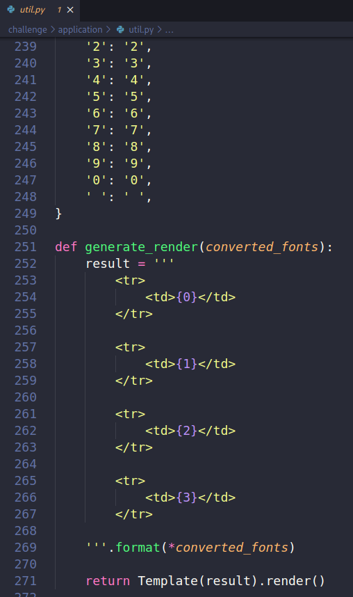 Leyendo los archivos del reto vemos un posible SSTI en la función generate_render().