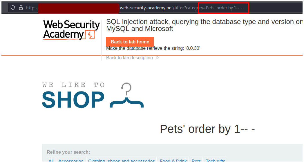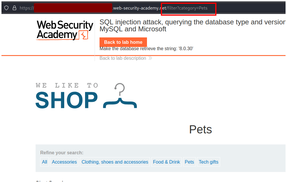 Podemos notar que en la url se agrega filter=category=Pets, esta parte del laboratorio es vulnerable a SQL injection.