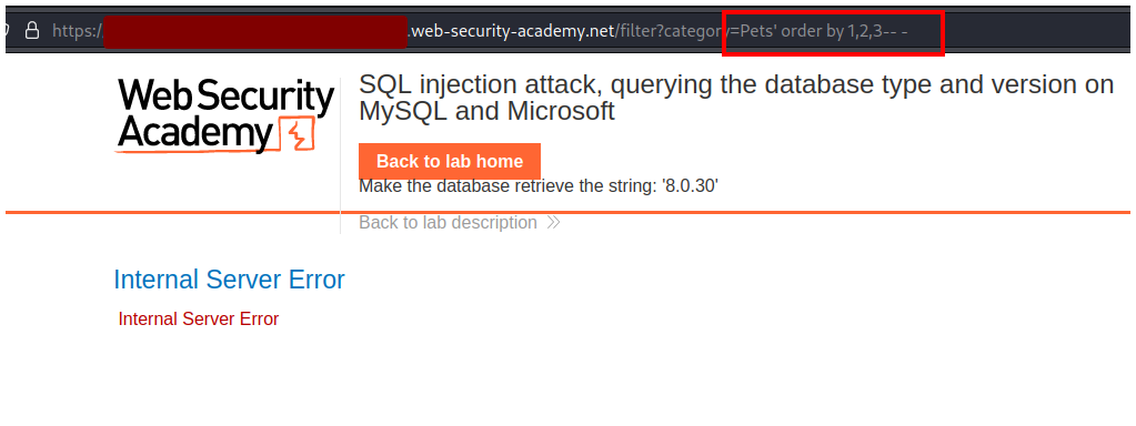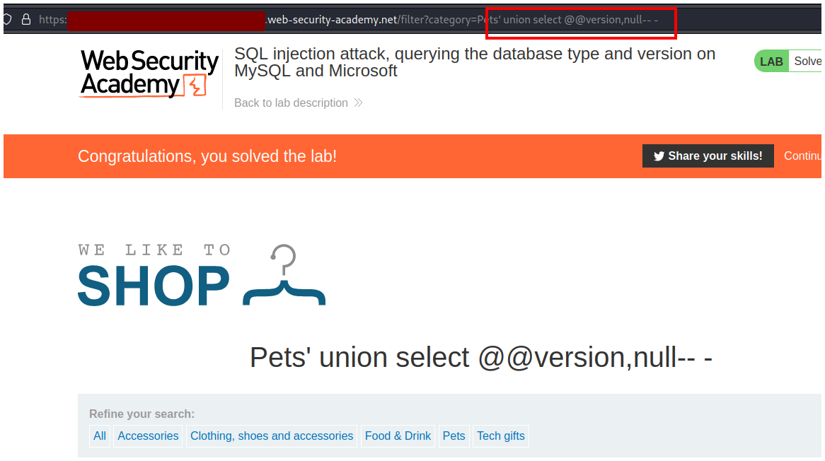 PortSwigger - SQL injection attack, querying the database type and version on MySQL and Microsoft.