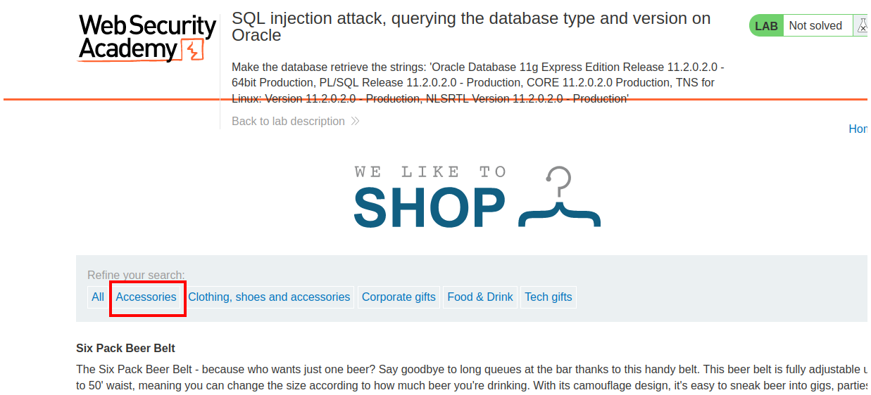 PortSwigger - SQL injection attack, querying the database type and version on Oracle.