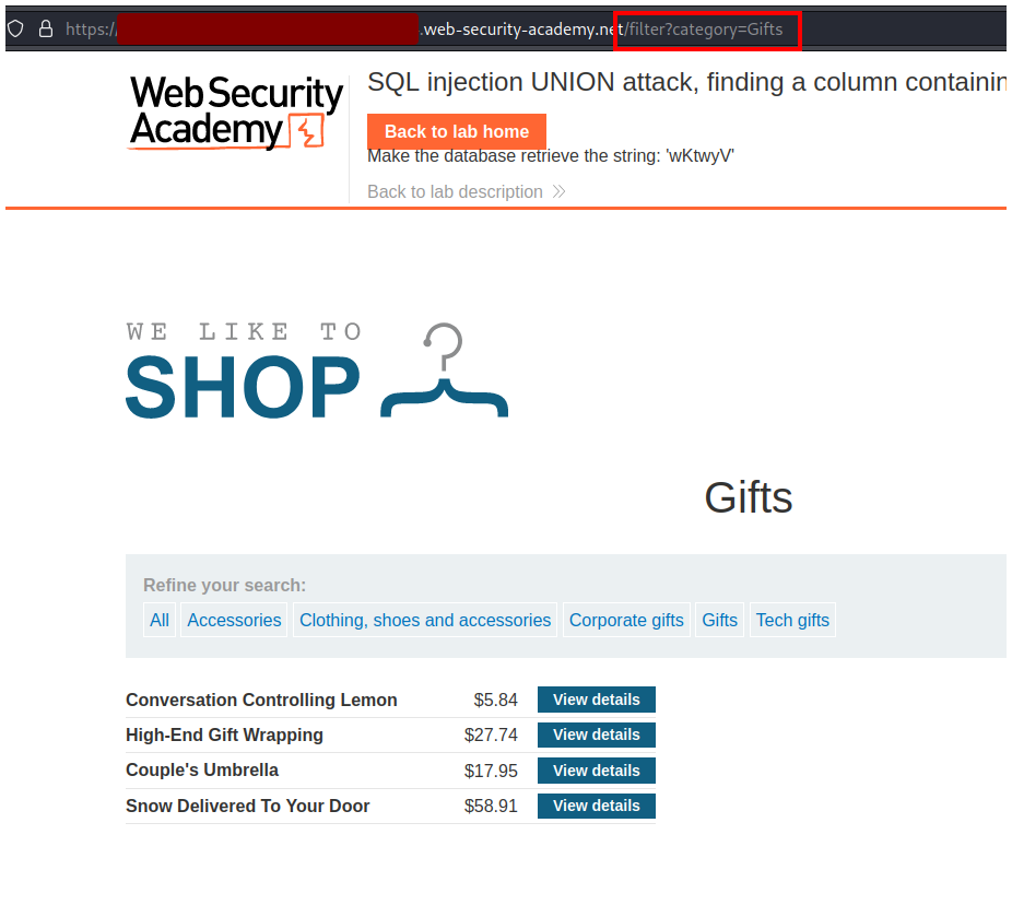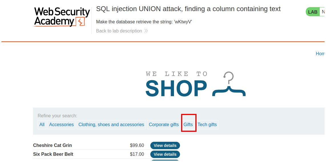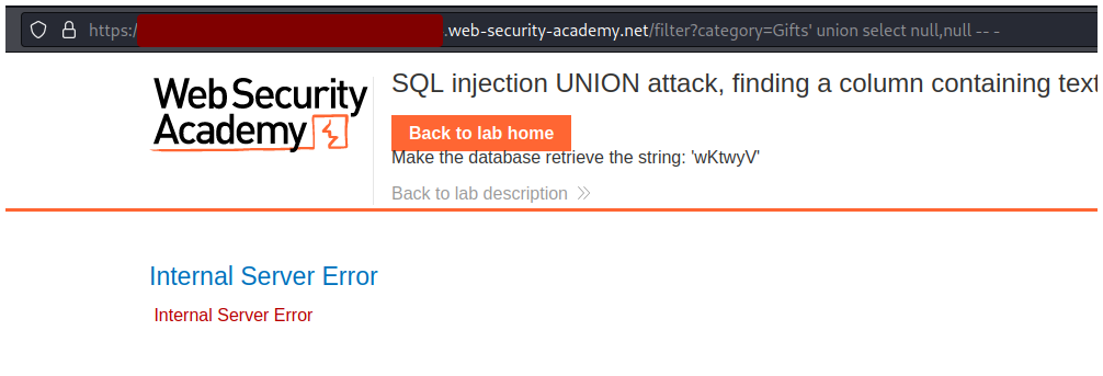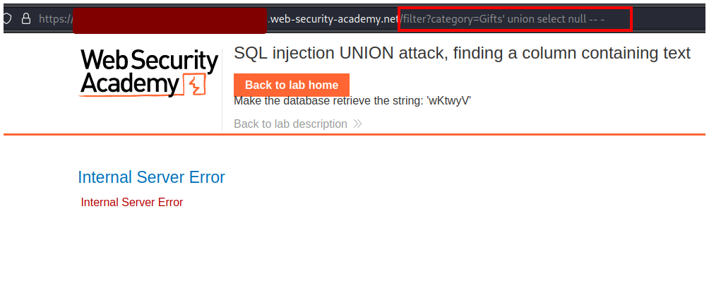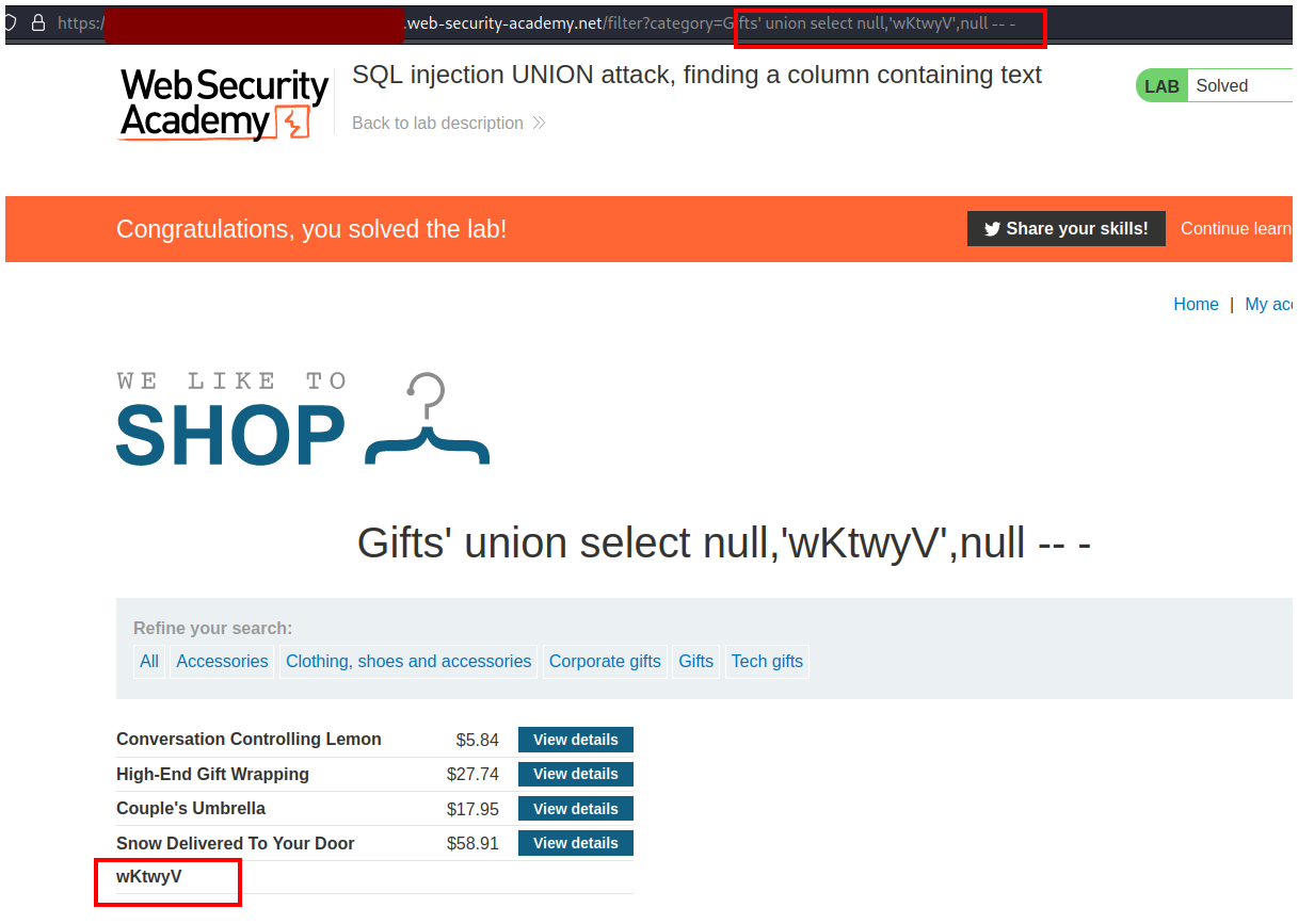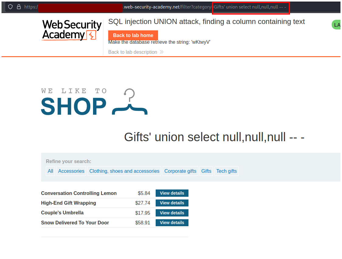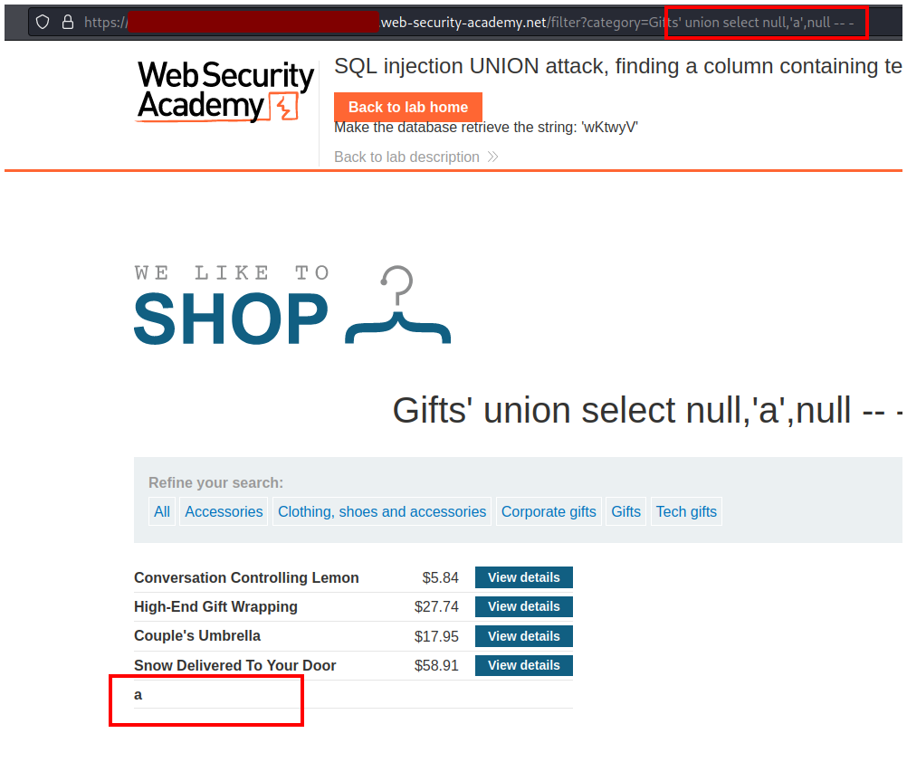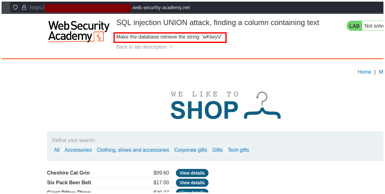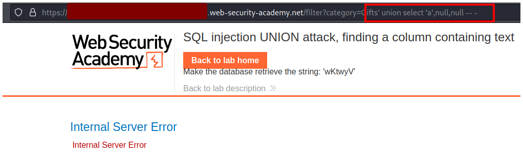 PortSwigger - SQL injection UNION attack, finding a column containing text.