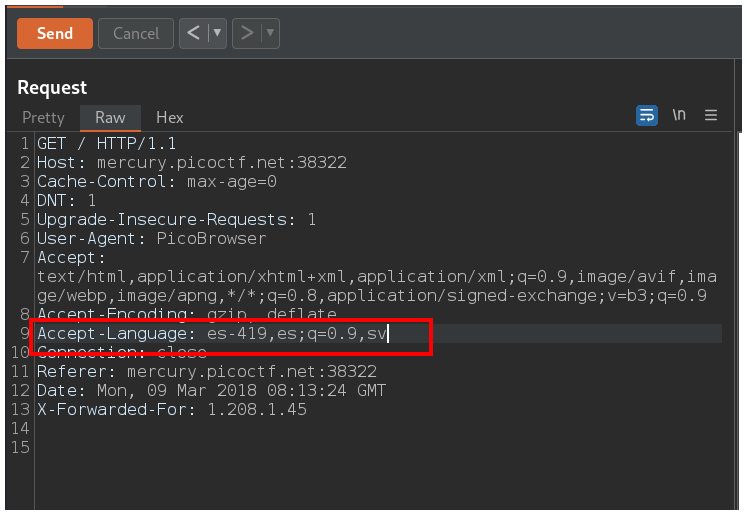 Para solucionar esto agregamos las siglas sv al final de la cabecera Accept-Language separado por una coma.