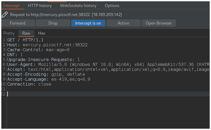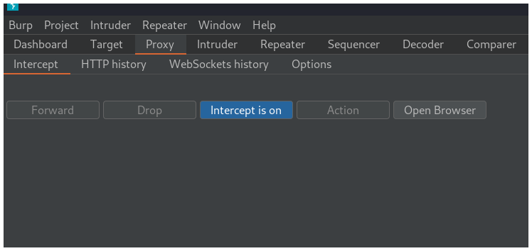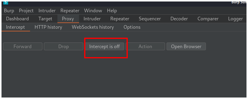 Hacemos click en el botón Intercept is off para que cambie a Intercept is on y así poder interceptar la petición con la que vamos a trabajar.